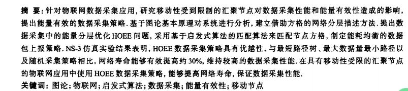 针对物联网数据采集应用,研究移动性受到限制的汇聚节点对数据采集性能和能量有效性造成的影响, 提出能量有效的数据采集策略.基于图论基本原理对系统进行分析,建立借助方格的网络分层描述方法.提出数 据采集中的能量分层优化HOEE问题,采用基于启发式算法的匹配算法来匹配节点方格,制定能耗均衡的数据 包上报策略.Nso仿真实验结果表明,HOEE数据采集策略具有优越性,与最短路径树、最大数据量最小路径以 及随机采集策略相比,网络寿命能够有效提高约30%,维持较高的数据采集性能.在具有移动性受限的汇聚节点 的物联网应用中使用HOEE数据采集策略,能够提高网络寿命,保证数据采集性能.