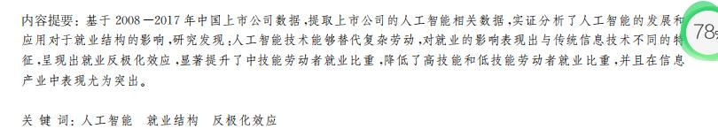 :基于 2008 - 2017 年中国上市公司数据 ,提取上市公司的人工智能相关数据 ,实证分析了人工智能的发展和 应用对于就业结构的影响 ,研究发现 :人工智能技术能够替代复杂劳动 ,对就业的影响表现出与传统信息技术不同的特 征 ,呈现出就业反极化效应 ,显著提升了中技能劳动者就业比重 ,降低了高技能和低技能劳动者就业比重 ,并且在信息 产业中表现尤为突出 。