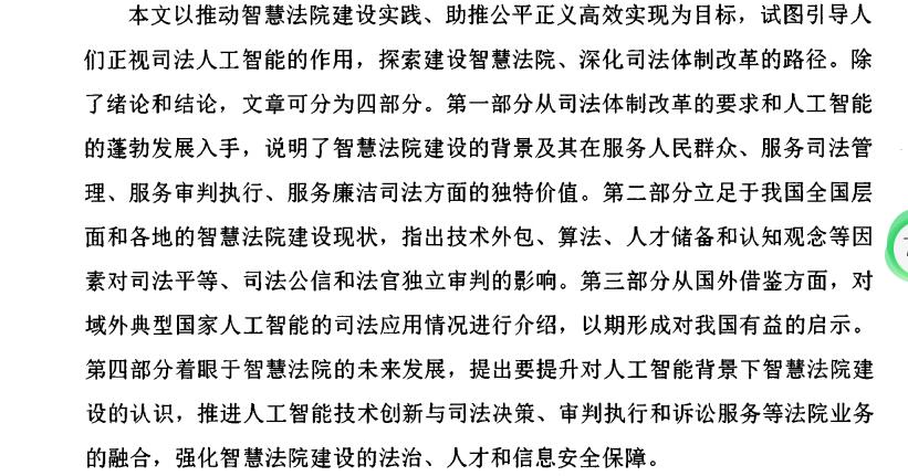 本文以推动智慧法院建设实践、助推公平正义高效实现为目标,试图引导人 们正视司法人工智能的作用,探索建设智慧法院、深化司法体制改革的路径。除 了绪论和结论,文章可分为四部分。第一部分从司法体制改革的要求和人工智能 的蓬勃发展入手,说明了智慧法院建设的背景及其在服务人民群众、服务司法管 理、服务审判执行、服务廉洁司法方面的独特价值。第二部分立足于我国全国层 面和各地的智慧法院建设现状,指出技术外包、算法、人才储备和认知观念等因 素对司法平等、司法公信和法官独立审判的影响。第三部分从国外借鉴方面,对 域外典型国家人工智能的司法应用情况进行介绍,以期形成对我国有益的启示。 第四部分着眼于智慧法院的未来发展,提出要提升对人工智能背景下智慧法院建 设的认识,推进人工智能技术创新与司法决策、审判执行和诉讼服务等法院业务 的融合,强化智慧法院建设的法治、人才和信息安全保障。