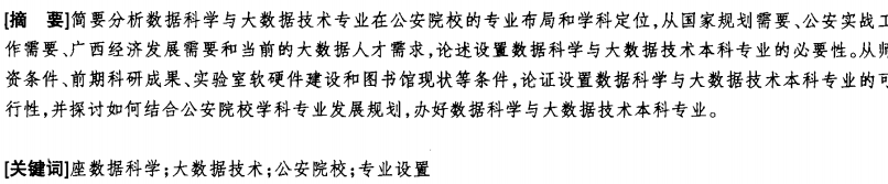 简要分析数据科学与大数据技术专业在公安院校的专业布局和学科定位,从国家规划需要、公安实战工 作需要、广西经济发展需要和当前的大数据人才需求,论述设置数据科学与大数据技术本科专业的必要性。从师 资条件、前期科研成果、实验室软硬件建设和图书馆现状等条件,论证设置数据科学与大数据技术本科专业的可 行性,并探讨如何结合公安院校学科专业发展规划,办好数据科学与大数据技术本科专业。
