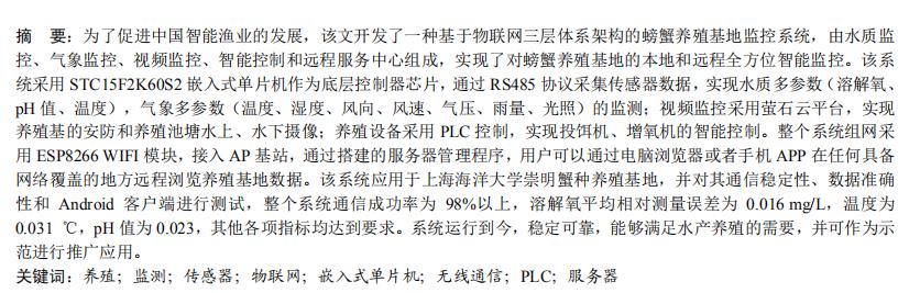 为了促进中国智能渔业的发展,该文开发了一种基于物联网三层体系架构的螃蟹养殖基地监控系统,由水质监 控、气象监控、视频监控、智能控制和远程服务中心组成,实现了对螃蟹养殖基地的本地和远程全方位智能监控。该系 统采用 STC15F2K60S2 嵌入式单片机作为底层控制器芯片,通过 RS485 协议采集传感器数据,实现水质多参数(溶解氧、 pH 值、温度),气象多参数(温度、湿度、风向、风速、气压、雨量、光照)的监测;视频监控采用萤石云平台,实现 养殖基的安防和养殖池塘水上、水下摄像;养殖设备采用 PLC 控制,实现投饵机、增氧机的智能控制。整个系统组网采 用 ESP8266 WIFI 模块,接入 AP 基站,通过搭建的服务器管理程序,用户可以通过电脑浏览器或者手机 APP 在任何具备 网络覆盖的地方远程浏览养殖基地数据。该系统应用于上海海洋大学崇明蟹种养殖基地,并对其通信稳定性、数据准确 性和 Android 客户端进行测试,整个系统通信成功率为 98%以上,溶解氧平均相对测量误差为 0.016 mg/L,温度为 0.031 ℃,pH 值为 0.023,其他各项指标均达到要求。系统运行到今,稳定可靠,能够满足水产养殖的需要,并可作为示 范进行推广应用。