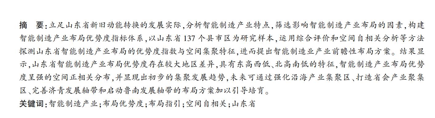 立足山东省新旧动能转换的发展实际,分析智能制造产业特点,筛选影响智能制造产业布局的因素,构建 智能制造产业布局优势度指标体系,以山东省 137 个县市区为研究样本,运用综合评价和空间自相关分析等方法 探测山东省智能制造产业布局的优势度指数与空间集聚特征,进而提出智能制造业产业前瞻性布局方案。 结果显 示,山东省智能制造产业布局优势度存在较大地区差异,具有东高西低、北高南低的特征,智能制造产业布局优势 度呈强的空间正相关分布,并显现出初步的集聚发展趋势,未来可通过强化沿海产业集聚区、打造省会产业聚集 区、完善济青发展轴带和启动鲁南发展轴带的布局方案加以引导培育。