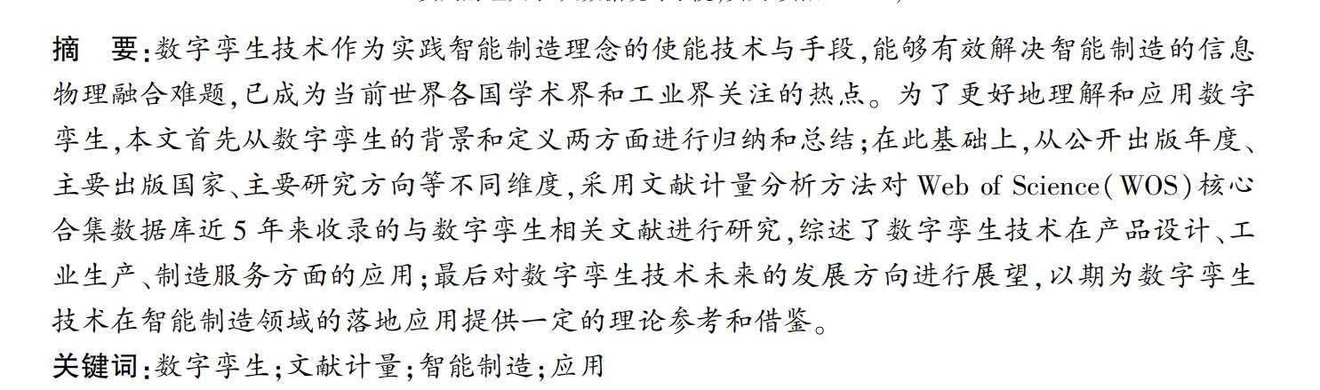 数字孪生技术作为实践智能制造理念的使能技术与手段,能够有效解决智能制造的信息 物理融合难题,已成为当前世界各国学术界和工业界关注的热点。 为了更好地理解和应用数字 孪生,本文首先从数字孪生的背景和定义两方面进行归纳和总结;在此基础上,从公开出版年度、 主要出版国家、主要研究方向等不同维度,采用文献计量分析方法对 Web of Science(WOS)核心 合集数据库近 5 年来收录的与数字孪生相关文献进行研究,综述了数字孪生技术在产品设计、工 业生产、制造服务方面的应用;最后对数字孪生技术未来的发展方向进行展望,以期为数字孪生 技术在智能制造领域的落地应用提供一定的理论参考和借鉴。