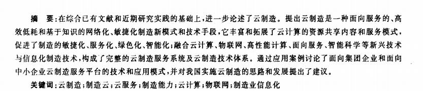 在综合已有文献和近期研究实践的基础上,进一步论述了云制造。提出云制造是一种面向服务的、高 效低耗和基于知识的网络化、敏捷化制造新模式和技术手段,它丰富和拓展了云计算的资源共享内容和服务模式, 促进了制造的敏捷化、服务化、绿色化、智能化;融合云计算、物联网、高性能计算、面向服务、智能科学等新兴技术 与信息化制造技术,构成』,完整的云制造服务系统及云制造技术体系。通过应用案例讨论了面向集团企业和面向 中小企业云制造服务平台的技术和应用模式,并对我国实施云制造的思路和发展提出了建议。
