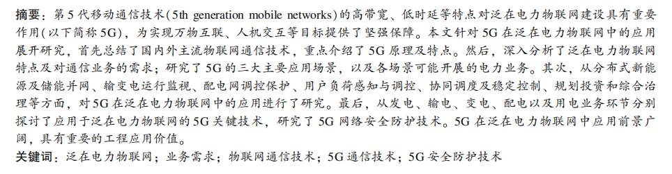 第 5 代移动通信技术(5th generation mobile networks)的高带宽、 低时延等特点对泛在电力物联网建设具有重要 作用(以下简称 5G), 为实现万物互联、 人机交互等目标提供了坚强保障。 本文针对 5G 在泛在电力物联网中的应用 展开研究, 首先总结了国内外主流物联网通信技术, 重点介绍了 5G 原理及特点。 然后, 深入分析了泛在电力物联网 特点及对通信业务的需求; 研究了 5G 的三大主要应用场景, 以及各场景可能开展的电力业务。 其次, 从分布式新能 源及储能并网、 输变电运行监视、 配电网调控保护、 用户负荷感知与调控、 协同调度及稳定控制、 规划投资和综合治 理等方面, 对 5G 在泛在电力物联网中的应用进行了研究。 最后, 从发电、 输电、 变电、 配电以及用电业务环节分别 探讨了应用于泛在电力物联网的 5G 关键技术, 研究了 5G 网络安全防护技术。 5G 在泛在电力物联网中应用前景广 阔, 具有重要的工程应用价值。