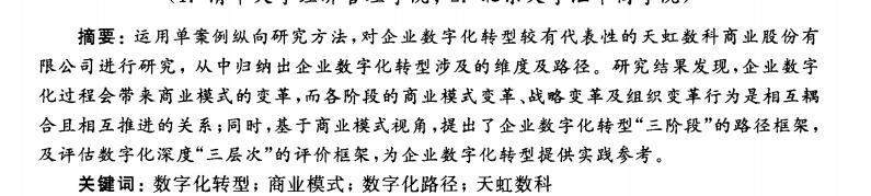运用单案例纵向研究方法,对企业数字化转型较有代表性的天虹数科商业股份有 限公司进行研究,从中归纳出企业数字化转型涉及的维度及路径。研究结果发现,企业数字 化过程会带来商业模式的变革,而各阶段的商业模式变革、战略变革及组织变革行为是相互耦 合且相互推进的关系;同时,基于商业模式视角,提出了企业数字化转型“三阶段”的路径框架, 及评估数字化深度“三层次”的评价框架,为企业数字化转型提供实践参考。