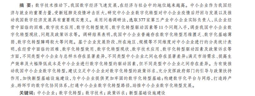 数字技术推动下,我国数字经济飞速发展,在经济与社会中的地位越来越高。中小企业作为我国经 济与就业的重要力量,受新冠肺炎疫情冲击巨大,研究中小企业数字化转型对中小企业疫情后纾困与发展以及推 动我国数字经济发展具有重要现实意义。采用问卷调研法,选取377家第三产业中小企业实际负责人,从企业经 营中面临的困难、数字技术应用、数字化转型效用、数字化转型驱动因素等11个问题入手,调查我国中小企业数 字化转型现状、问题及政策诉求等。调研结果表明,我国中小企业普遍存在数字化转型思维匮乏、数字化基础薄 弱、数字化转型障碍较大等问题。基于企业发展阶段、所在地区、规模等不同维度对中小企业进行的分类统计表 明,在经营中面临的困难、数字化转型效用、数字化转型现状、数字技术应用、数字化转型驱动因素及政策诉求等 方面,不同类型中小企业与总样本存在显著差异,不同类型中小企业之间也存在显著差异;满足市场需求、提高生 产效率及大幅降低成本是中小企业进行数字化转型的驱动因素,但不同类型中小企业之间存在差异。为有效推 动我国中小企业数字化转型,建议立足中小企业对数字化转型的政策诉求,充分发挥政府部门的引导与政策扶持 作用,加快新型基础设施建设,为中小企业提供更加牢固的数字化转型基础;构建数字化平台与网络,打造跨产 业、跨环节的数字化协同体系,打通中小企业数字化转型路径,助推中小企业数字化转型发展