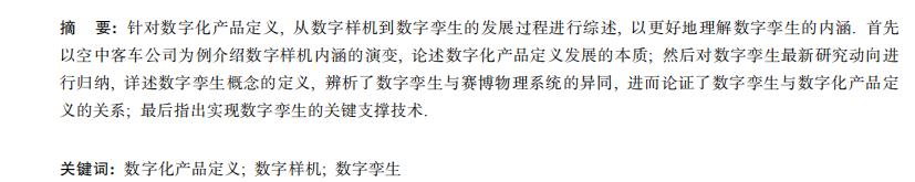 针对数字化产品定义, 从数字样机到数字孪生的发展过程进行综述, 以更好地理解数字孪生的内涵. 首先 以空中客车公司为例介绍数字样机内涵的演变, 论述数字化产品定义发展的本质; 然后对数字孪生最新研究动向进 行归纳, 详述数字孪生概念的定义, 辨析了数字孪生与赛博物理系统的异同, 进而论证了数字孪生与数字化产品定 义的关系; 最后指出实现数字孪生的关键支撑技术.