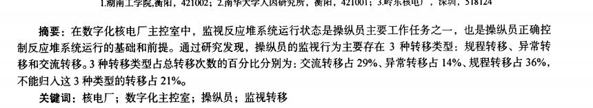 在数字化核电厂主控室中,监视反应堆系统运行状态是操纵员主要工作任务之一,也是操纵员正确控 制反应堆系统运行的基础和前提。通过研究发现,操纵员的监视行为主要存在3种转移类型:规程转移、异常转 移和交流转移。3种转移类型占总转移次数的百分比分别为:交流转移占29%、异常转移占14%、规程转移占36%, 不能归入这3种类型的转移占21%。