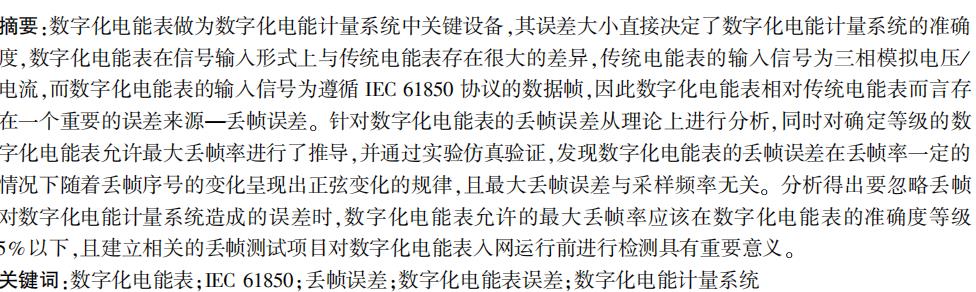 数字化电能表做为数字化电能计量系统中关键设备,其误差大小直接决定了数字化电能计量系统的准确 度,数字化电能表在信号输入形式上与传统电能表存在很大的差异,传统电能表的输入信号为三相模拟电压/ 电流,而数字化电能表的输入信号为遵循 IEC 61850 协议的数据帧,因此数字化电能表相对传统电能表而言存 在一个重要的误差来源—丢帧误差。 针对数字化电能表的丢帧误差从理论上进行分析,同时对确定等级的数 字化电能表允许最大丢帧率进行了推导,并通过实验仿真验证,发现数字化电能表的丢帧误差在丢帧率一定的 情况下随着丢帧序号的变化呈现出正弦变化的规律,且最大丢帧误差与采样频率无关。 分析得出要忽略丢帧 对数字化电能计量系统造成的误差时,数字化电能表允许的最大丢帧率应该在数字化电能表的准确度等级 5%以下,且建立相关的丢帧测试项目对数字化电能表入网运行前进行检测具有重要意义。