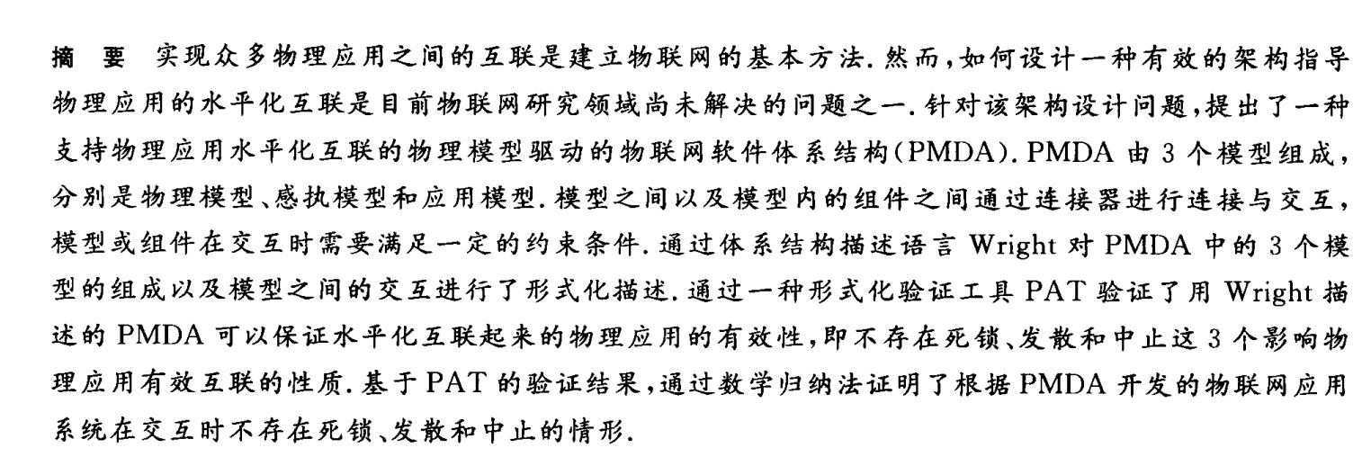 实现众多物理应用之间的互联是建立物联网的基本方法.然而,如何设计一种有效的架构指导 物理应用的水平化互联是目前物联网研究领域尚未解决的问题之一.针对该架构设计问题,提出了一种 支持物理应用水平化互联的物理模型驱动的物联网软件体系结构(PMDA).PMDA由3个模型组成, 分别是物理模型、感执模型和应用模型.模型之间以及模型内的组件之间通过连接器进行连接与交互, 模型或组件在交互时需要满足一定的约束条件.通过体系结构描述语言Wright对PMDA中的3个模 型的组成以及模型之间的交互进行了形式化描述.通过一种形式化验证工具PAT验证了用Wright描 述的PMDA可以保证水平化互联起来的物理应用的有效性,即不存在死锁、发散和中止这3个影响物 理应用有效互联的性质.基于PAT的验证结果,通过数学归纳法证明了根据PMDA开发的物联网应用 系统在交互时不存在死锁、发散和中止的情形.