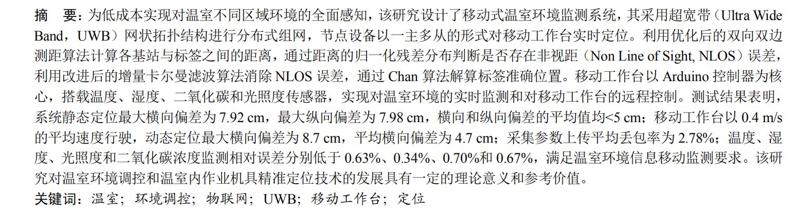 为低成本实现对温室不同区域环境的全面感知,该研究设计了移动式温室环境监测系统,其采用超宽带(Ultra Wide Band,UWB)网状拓扑结构进行分布式组网,节点设备以一主多从的形式对移动工作台实时定位。利用优化后的双向双边 测距算法计算各基站与标签之间的距离,通过距离的归一化残差分布判断是否存在非视距(Non Line of Sight, NLOS)误差, 利用改进后的增量卡尔曼滤波算法消除 NLOS 误差,通过 Chan 算法解算标签准确位置。移动工作台以 Arduino 控制器为核 心,搭载温度、湿度、二氧化碳和光照度传感器,实现对温室环境的实时监测和对移动工作台的远程控制。测试结果表明, 系统静态定位最大横向偏差为 7.92 cm,最大纵向偏差为 7.98 cm,横向和纵向偏差的平均值均<5 cm;移动工作台以 0.4 m/s 的平均速度行驶,动态定位最大横向偏差为 8.7 cm,平均横向偏差为 4.7 cm;采集参数上传平均丢包率为 2.78%;温度、湿 度、光照度和二氧化碳浓度监测相对误差分别低于 0.63%、0.34%、0.70%和 0.67%,满足温室环境信息移动监测要求。该研 究对温室环境调控和温室内作业机具精准定位技术的发展具有一定的理论意义和参考价值。