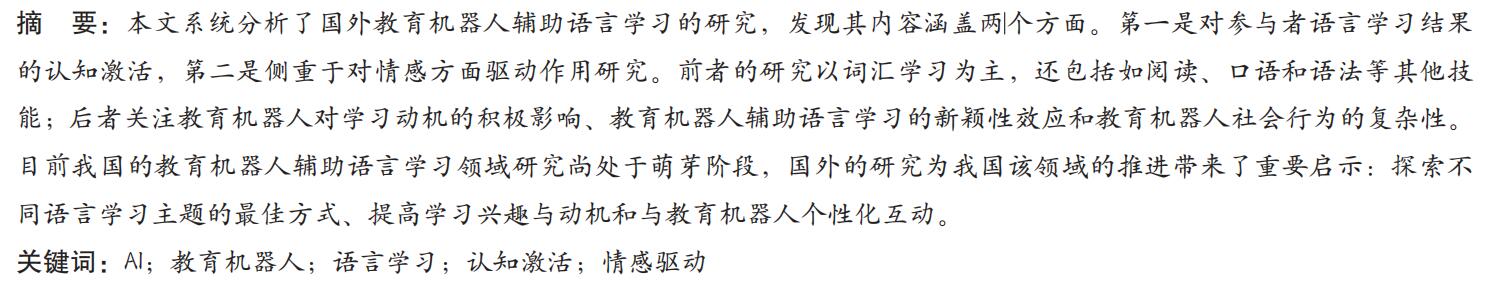 本文系统分析了国外教育机器人辅助语言学习的研究,发现其内容涵盖两个方面。第一是对参与者语言学习结果的认知激活,第二是侧重于对情感方面驱动作用研究。前者的研究以词汇学习为主,还包括如阅读、口语和语法等其他技能;后者关注教育机器人对学习动机的积极影响、教育机器人辅助语言学习的新颖性效应和教育机器人社会行为的复杂性。目前我国的教育机器人辅助语言学习领域研究尚处于萌芽阶段,国外的研究为我国该领域的推进带来了重要启示:探索不同语言学习主题的最佳方式、提高学习兴趣与动机和与教育机器人个性化互动。