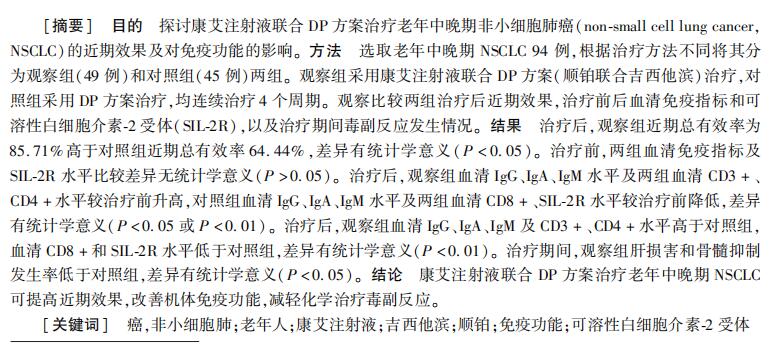 目的 探讨康艾注射液联合 DP 方案治疗老年中晚期非小细胞肺癌(non-small cell lung cancer, NSCLC)的近期效果及对免疫功能的影响。 方法 选取老年中晚期 NSCLC 94 例,根据治疗方法不同将其分 为观察组(49 例)和对照组(45 例)两组。 观察组采用康艾注射液联合 DP 方案(顺铂联合吉西他滨)治疗,对 照组采用 DP 方案治疗,均连续治疗 4 个周期。 观察比较两组治疗后近期效果,治疗前后血清免疫指标和可 溶性白细胞介素-2 受体(SIL-2R),以及治疗期间毒副反应发生情况。