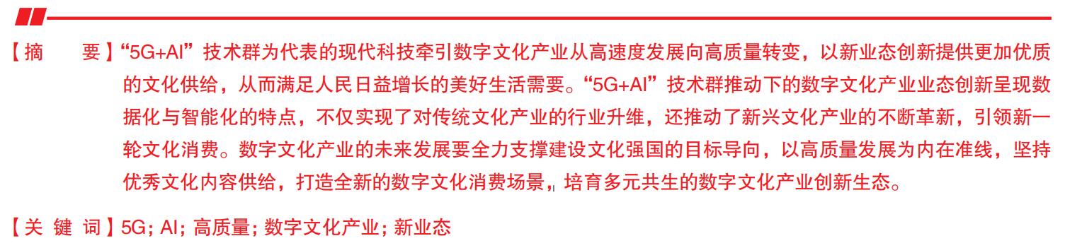 “5G+AI”技术群为代表的现代科技牵引数字文化产业从高速度发展向高质量转变,以新业态创新提供更加优质的文化供给,从而满足人民日益增长的美好生活需要。“5G+AI”技术群推动下的数字文化产业业态创新呈现数据化与智能化的特点,不仅实现了对传统文化产业的行业升维,还推动了新兴文化产业的不断革新,引领新一轮文化消费。数字文化产业的未来发展要全力支撑建设文化强国的目标导向,以高质量发展为内在准线,坚持优秀文化内容供给,打造全新的数字文化消费场景,培育多元共生的数字文化产业创新生态。