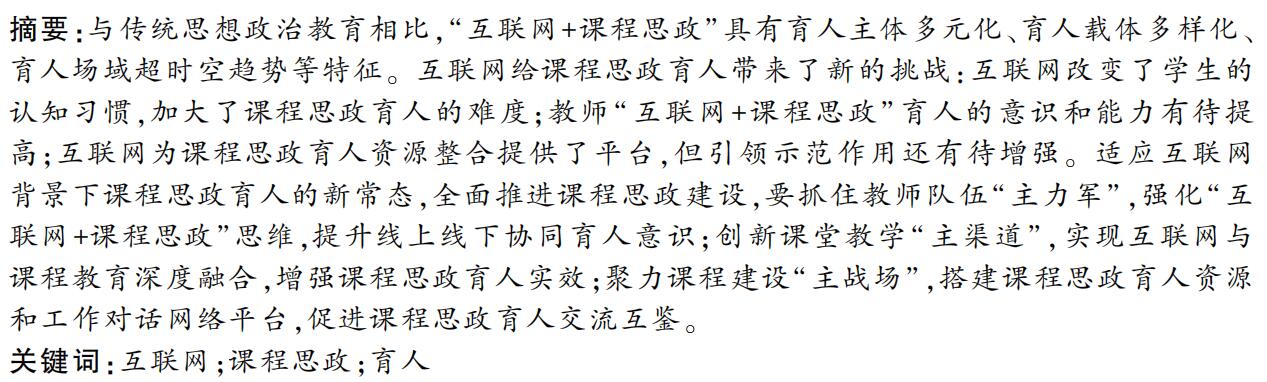 与传统思想政治教育相比,“互联网+课程思政”具有育人主体多元化、育人载体多样化、 育人场域超时空趋势等特征。 互联网给课程思政育人带来了新的挑战:互联网改变了学生的 认知习惯,加大了课程思政育人的难度;教师“ 互联网+课程思政” 育人的意识和能力有待提 高;互联网为课程思政育人资源整合提供了平台,但引领示范作用还有待增强。 适应互联网 背景下课程思政育人的新常态,全面推进课程思政建设,要抓住教师队伍“主力军” ,强化“互 联网+课程思政”思维,提升线上线下协同育人意识;创新课堂教学“ 主渠道” ,实现互联网与 课程教育深度融合,增强课程思政育人实效;聚力课程建设“主战场” ,搭建课程思政育人资源 和工作对话网络平台,促进课程思政育人交流互鉴。