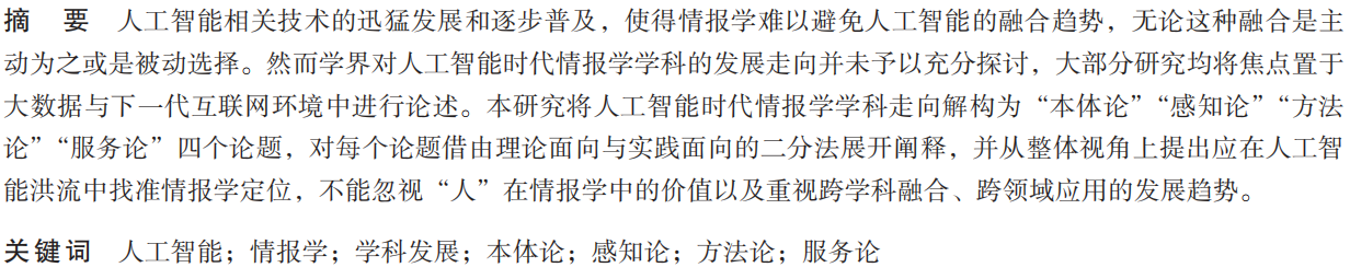 人工智能相关技术的迅猛发展和逐步普及,使得情报学难以避免人工智能的融合趋势,无论这种融合是主 动为之或是被动选择。然而学界对人工智能时代情报学学科的发展走向并未予以充分探讨,大部分研究均将焦点置于 大数据与下一代互联网环境中进行论述。本研究将人工智能时代情报学学科走向解构为“本体论”“感知论”“方法 论”“服务论”四个论题,对每个论题借由理论面向与实践面向的二分法展开阐释,并从整体视角上提出应在人工智 能洪流中找准情报学定位,不能忽视“人”在情报学中的价值以及重视跨学科融合、跨领域应用的发展趋势。