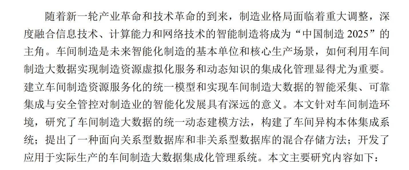 随着新一轮产业革命和技术革命的到来,制造业格局面临着重大调整,深 度融合信息技术、计算能力和网络技术的智能制造将成为“中国制造 2025”的 主角。车间制造是未来智能化制造的基本单位和核心生产场景,如何利用车间 制造大数据实现制造资源虚拟化服务和动态知识的集成化管理显得尤为重要。 建立车间制造资源服务化的统一模型和实现车间制造大数据的智能采集、可靠 集成与安全管控对制造业的智能化发展具有深远的意义。本文针对车间制造环 境,研究了车间制造大数据的统一动态建模方法,构建了车间异构本体集成系 统;提出了一种面向关系型数据库和非关系型数据库的混合存储方法;开发了 应用于实际生产的车间制造大数据集成化管理系统。本文主要研究内容如下: (1)基于本体建立了车间制造大数据的动态统一模型。归纳和总结车间制 造大数据的特征,研究车间制造数据的合理有效地分类方法,提出了车间制造 大数据的四维分类结构。创建车间制造数据的元元模型,解决其统一数据描述 问题,并给出了车间制造生产过程工业数据统一模型。利用 OWL 语言对车间制 造大数据进行本体结构描述,分为基本信息本体、静态数据本体和动态数据本 体。最后,为有效解决异构本体知识共享和重用问题,提出了车间制造数据异 构本体集成框架。 (2)研究了车间制造大数据的集成化管理方法。主要从数据采集、预处理 和分布式存储三个方面对车间制造大数据集成化管理进行研究。在车间制造大 数据采集方面,设计了基于 PLC 和智能电表的车间装备运行状态信息采集方式、 基于 RFID 技术的车间物流信息采集方式、基于温湿度传感器和颗粒物传感器的 车间环境信息采集方式。在车间制造大数据预处理方面,提出了数据的填补、 去噪和去冗余方法。在车间制造大数据分布式存储方面,设计了一种面向关系 型数据库和非关系型数据库的混合存储方法。 (3)设计与实现了基于 B/S 架构的车间制造大数据集成化管理系统。通过 设备的管理、信息的感知和大数据的预处理来进行有效地集成和管理车间制造 数据。实现了有效地监测车间生产状态、管控数据资源。系统结合某公司车间 实际生产过程完成了对制造数据的集成化管理。