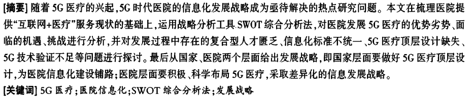 随着5G医疗的兴起,5G时代医院的信息化发展战略成为亟待解决的热点研究问题。本文在梳理医院提供“互联网+医疗”服务现状的基础上.运用战略分析工具SWOT综合分析法,对医院发展5G医疗的优势劣势、面临的机遇、挑战进行分析,并对发展过程中存在的复合型人才匮乏、信息化标准不统一、5G医疗顶层设计缺失、5G技术验证不足等问题进行探讨。最后从国家、医院两个层面给出发展战略,即国家层面要做好5G医疗顶层设计。为医院信息化建设铺路;医院层面要积极、科学布局5G医疗,采取差异化的信息发展战略。