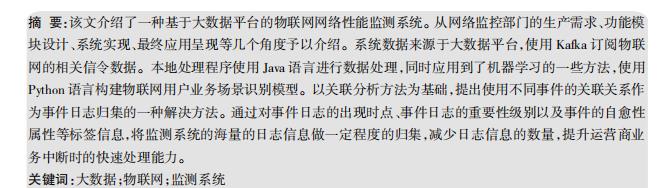 本文介绍了基于大数据平台的物联网网络性能监 测系统。从网络运营商的角度,分析了运营商网络在物 联网性能监控方面的生产需求。系统设计遵循 LTE 信 令监测及互联网 KQI 指标规范,自动获取运营商 DPI 数据中相关 XDR 字段,多维度计算性能指标。并出于安 全考虑,使用深度神经网络训练识别模型用于标识观测 对象。 以关联分析方法为基础,提出使用不同事件的关联 关系作为事件日志归集的一种解决方法。能够通过对事 件日志的出现时点、事件日志的重要性级别以及事件的 自愈性属性等标签信息,将海量的日志信息做一定程度 的归集,减少日志信息的数量,从而减轻故障处理人员 在面对突发问题时面对海量信息时的压力,有助于对网 络故障的快速诊断及定位。 监测系统目前已使用于真实生产环境下的物联网 网络性能监控,并能有效定位网络中存在的问题。