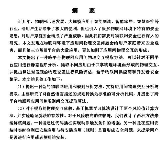 近几年,物联网迅速发展,大规模应用于智能制造、智能家居、智慧医疗等行业,给用户生活带来了极大的便利,但也引入了很多物联网环境下特有的安全隐患,对用户家庭安全构成了严重威胁,因此我们需要对物联网安全进行深入的研究。本文发现在物联网环境下应用间物理交互问题会给用户家庭带来安全危害,而且第三方规则平台的大量应用,更加加剧了应用间物理交互的形成。