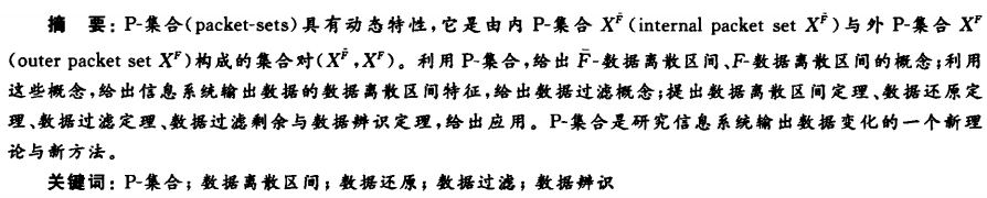 P-集合(packet-sets)具有动态特性,它是由内p-集合XF(internalpacketsetXF)与外P-集合XF (outerpacketsetXF)构成的集合对(XF,XF)。利用p-集合,给出F-数据离散区间、F-数据离散区间的概念;利用 这些概念,给出信息系统输出数据的数据离散区间特征,给出数据过滤概念;提出数据离散区间定理、数据还原定 理、数据过滤定理、数据过滤剩余与数据辨识定理,给出应用。p-集合是研究信息系统输出数据变化的一个新理 论与新方法。