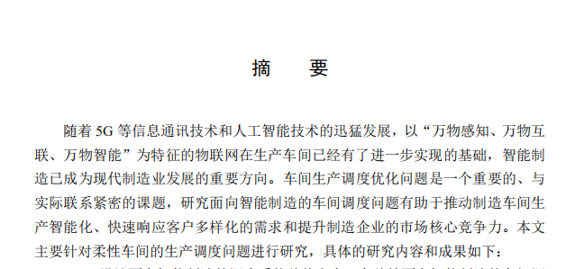 随着 5G 等信息通讯技术和人工智能技术的迅猛发展,以“万物感知、万物互 联、万物智能”为特征的物联网在生产车间已经有了进一步实现的基础,智能制 造已成为现代制造业发展的重要方向。车间生产调度优化问题是一个重要的、与 实际联系紧密的课题,研究面向智能制造的车间调度问题有助于推动制造车间生 产智能化、快速响应客户多样化的需求和提升制造企业的市场核心竞争力。本文 主要针对柔性车间的生产调度问题进行研究
