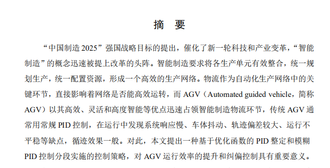 “中国制造 2025”强国战略目标的提出,催化了新一轮科技和产业变革,“智能 制造”的概念迅速被提上改革的头阵。智能制造要求将各生产单元有效整合,统一规 划生产,统一配置资源,形成一个高效的生产网络。物流作为自动化生产网络中的关 键环节,直接影响着网络是否能高效运转,而 AGV(Automated guided vehicle,简称 AGV)以其高效、灵活和高度智能等优点迅速占领智能制造物流环节,传统 AGV 通 常用常规 PID 控制,在运行中发现系统响应慢、车体抖动、轨迹偏差较大、运行不 平稳等缺点,循迹效果一般。对此,本文提出一种基于优化函数的 PID 整定和模糊 PID 控制分段实施的控制策略,对 AGV 运行效率的提升和纠偏控制具有重要意义。