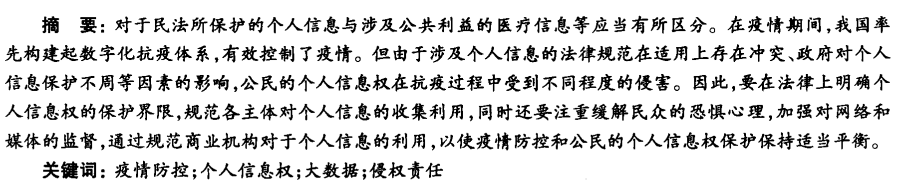于民法所保护的个人信息与涉及公共利益的医疗信息等应当有所区分。在疫情期间,我国率 先构建起数字化抗疫体系,有效控制了疫情。但由于涉及个人信息的法律规范在适用上存在冲突、政府对个人 信息保护不周等因素的影响,公民的个人信息权在抗疫过程中受到不同程度的侵害。因此,要在法律上明确个 人信息权的保护界限,规范各主体对个人信息的收集利用,同时还要注重缓解民众的恐惧心理,加强对网络和 媒体的监督,通过规范商业机构对于个人信息的利用,以使疫情防控和公民的个人信息权保护保持适当平衡。