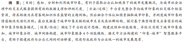 [目的] 感知、 分析和利用城市印象, 有利于获取公众认知视角下的城市发展概况, 为城市社会治理中的交互式服务提供有效的数据支撑和评测尺度。 [方法/ 过程] 平台首先整合导向城市印象的社交媒介标签资源, 将其转换为具有客观知识体系监督的主题网络; 然后融合个体认知因素抽取城市印象, 并测度城市印象的情感极性及演化历程; 最后发掘基于城市印象关联的城市关系及其社群结构, 探讨基于典型场景及业务需求的城市印象多维服务模式。 [结果/ 结论] 阐述了平台的设计思路、 构建流程和功能框架, 并依次实现了城市印象感知、 城市印象分析、 城市网络构建、 城市印象服务 4 个功能模块。 据文中方法构建的 “印象·城市” 智慧服务平台, 有助于搭建政府与公众之间的对话桥梁, 促进形成政府与公众统一的城市发展愿景