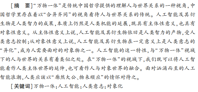 ]“万物一体”是传统中国哲学提供的理解人与世界关系的一种视角,中 国哲学里存在着以“合异齐同”的视角看待人与世界关系的传统。 人工智能及其衍 生物是人类智力的成果,本质上仍然是人类机能的延展,既具有主体性意义,也具有 对象性意义。 从主体性意义上说,人工智能及其衍生物依旧是人类智力的产物,受人 类意志控制;从对象性意义上说,人工智能及其衍生物在一定意义上是人类意志的 “异化”,成为人需要面对的对象物之一。 人工智能的这一特性,与“万物一体”视域 下的人与世界的关系有着类似之处。 在“万物一体”的视域下,我们既可以将人工智 能看作人类主体世界的延伸,也可看作人与对象世界的融合。 面对汹涌而至的人工 智能浪潮,人类应该以“廓然大公、物来顺应”的情怀对待之。