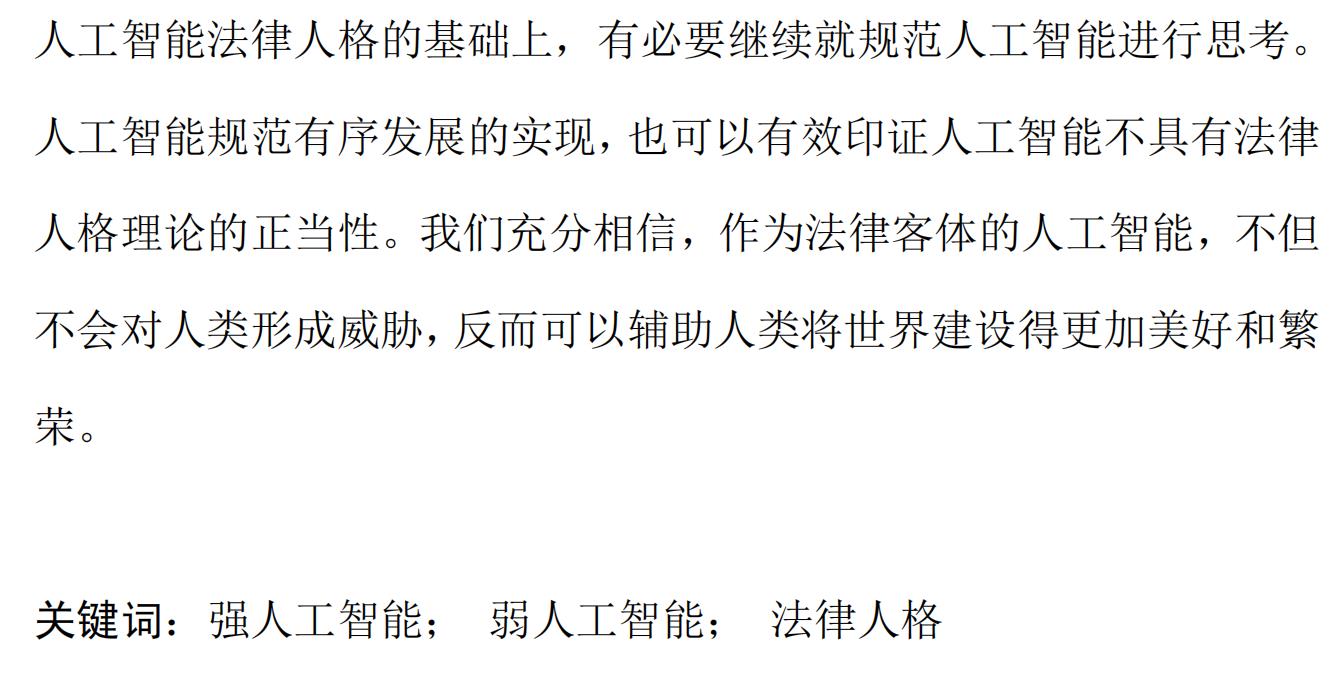 不应当赋予人工智能法律人格。在否定 万方数据 人工智能法律人格的基础上,有必要继续就规范人工智能进行思考。 人工智能规范有序发展的实现,也可以有效印证人工智能不具有法律 人格理论的正当性。我们充分相信,作为法律客体的人工智能,不但 不会对人类形成威胁,反而可以辅助人类将世界建设得更加美好和繁 荣。