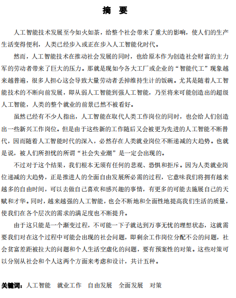 人工智能技术发展至今如火如荼,给整个社会带来了重大的影响,使人们的生产 生活变得便利,人类已经步入或正在步入人工智能化时代。 然而,人工智能技术在推动社会发展的同时,也给原本作为创造社会财富的主力 军的劳动者带来了巨大的压力。那就是现如今各大工厂或企业的“智能代工”现象越 来越普遍,很多人担心这会导致大量劳动者丢掉维持生计的饭碗。尤其是随着人工智 能技术的不断向前发展,即从弱人工智能到强人工智能,乃至将来可能创造出的超级 人工智能,人类的整个就业的前景已然不被看好。