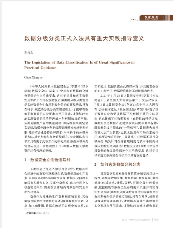 《中华人民共和国数据安全法(草案))(以下简称(数据安全法(草案))中首次对数据的分级分类保护作出明确要求,这对于指导和落实数据安全保护工作具有重要意义数据的分级分类管理是实施数据全生命周期安全保护的重要基础.只有在科学.规范的分级分类管理基础上.才能够有效地平衡数据的安全要求与使用需求,才能够较好地实现数据的风险管理成本与利用效益的平衡,从面为数据产业的快速健康.可持续发展奠定堅实基础数据分级分类不仅需要遵循相关规范和标准.还要结合业务特征和需求,采取科学的分级分类方法对于大型和复杂系统而言。专业团队和术工具有助于此项工作的顺利开展数据分级分类管理应当是一项持续性工作.可纳人数据及数据资产运营管理的范畴