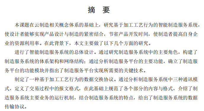 本课题在云制造相关概念体系的基础上,研究基于加工工艺行为的智能制造服务系统, 使设计者能够实现产品设计与制造的紧密结合,节省产品开发时间,使制造者提高自身企 业的资源利用率。在此背景下,本文主要做了以下几个方面的研究。