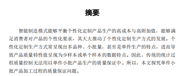 智能制造模式能够平衡个性化定制产品生产的高成本与高附加值,能够满 足消费者对产品的个性化要求,其大大推动了个性化定制生产方式的发展。个 性化定制生产方式常呈现出多品种、小批量,甚至是单件生产的特点,进而导 致产品质量特性值呈现为少样本或单个样本的数据特点。因此,传统的统计过 程质量控制无法用以单件小批产品生产的质量保证中。所以,本文探究单件小 批产品加工过程的质量保证问题。