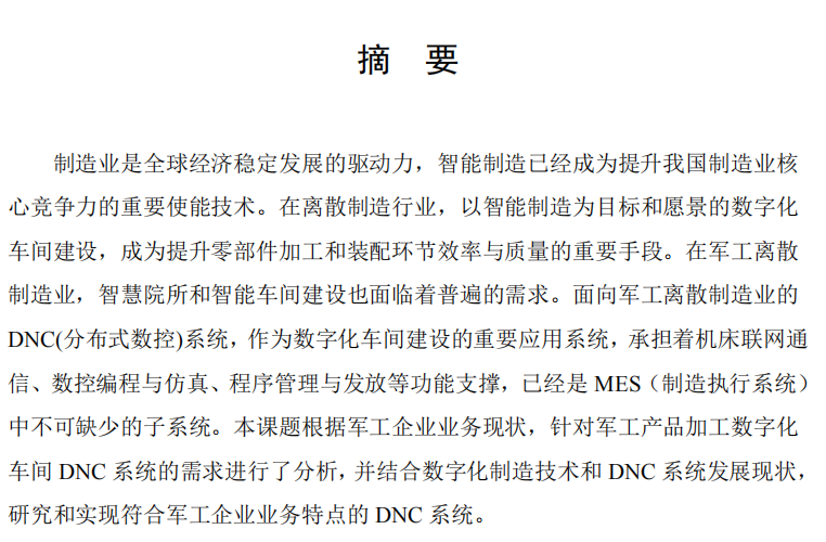制造业是全球经济稳定发展的驱动力,智能制造已经成为提升我国制造业核 心竞争力的重要使能技术。在离散制造行业,以智能制造为目标和愿景的数字化 车间建设,成为提升零部件加工和装配环节效率与质量的重要手段。在军工离散 制造业,智慧院所和智能车间建设也面临着普遍的需求。面向军工离散制造业的 DNC(分布式数控)系统,作为数字化车间建设的重要应用系统,承担着机床联网通 信、数控编程与仿真、程序管理与发放等功能支撑,已经是 MES(制造执行系统) 中不可缺少的子系统。本课题根据军工企业业务现状,针对军工产品加工数字化 车间 DNC 系统的需求进行了分析,并结合数字化制造技术和 DNC 系统发展现状, 研究和实现符合军工企业业务特点的 DNC 系统。