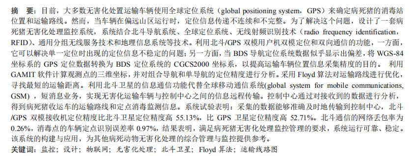 目前,大多数无害化处置运输车辆使用全球定位系统(global positioning system,GPS)来确定病死猪的消毒站 位置和运输路线。然而,当车辆在偏远山区运行时,定位信息传递不连续和不完整。为了解决这个问题,设计了一套病 死猪无害化处理监控系统,系统结合北斗导航系统、全球定位系统、无线射频识别技术(radio frequency identification, RFID)、通用分组无线服务技术和地理信息系统等技术。利用北斗/GPS 双模用户机双模定位和双向通信的功能,一方面, 它可以解决单一定位时出现的定位信息不稳定的问题;另一方面,当 BDS 导航定位系统数据似乎显示出偏差,将 WGS-84 坐标系的 GPS 定位数据转换为 BDS 定位系统的 CGCS2000 坐标系,以提高运输车辆位置信息采集精度的目的。 利用 GAMIT 软件计算观测点的三维坐标,并对组合导航和单导航的定位精度进行分析。采用 Floyd 算法对运输路线进行优化, 寻找最短的运输距离。利用北斗卫星的信息通信功能代替全球移动通信系统(global system for mobile communications, GSM) ,短消息业务,实现无害化运输车辆与控制中心之间的信息远程传输。控制中心通过对接收到的数据进行分析, 得到病死猪收运车的运输路线和定点消毒监测信息。系统试验表明:采集的数据能够准确及时地传输到控制中心,北斗 /GPS 双模接收机定位精度比北斗卫星定位精度高 55.13%,比 GPS 卫星定位精度高 52.71%。北斗通信的网络丢包率为 0.26%,消毒点的车辆定点识别误差率 0.97%,结果表明,满足病死猪无害化处理监控管理的要求,系统运行可靠、稳定。 该系统的构建与应用,为其他病死动物无害化处理的综合管理与监控提供参考。