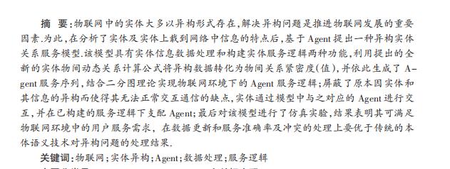 物联网中的实体大多以异构形式存在,解决异构问题是推进物联网发展的重要 因素.为此,在分析了实体及实体上载到网络中信息的特点后,基于 Agent 提出一种异构实体 关系服务模型.该模型具有实体信息数据处理和构建实体服务逻辑两种功能,利用提出的全 新的实体物间动态关系计算公式将异构数据转化为物间关系紧密度(值),并依此生成了 A- gent 服务序列,结合二分图理论实现物联网环境下的 Agent 服务逻辑;屏蔽了原本因实体和 其信息的异构而使得其无法正常交互通信的缺点,实体通过模型中与之对应的 Agent 进行交 互,并在已构建的服务逻辑下支配 Agent;最后对该模型进行了仿真实验,结果表明其可满足 物联网环境中的用户服务需求, 在数据更新和服务准确率及冲突的处理上要优于传统的本 体语义技术对异构问题的处理结果.