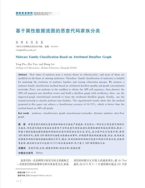 新型悉意代码的大量出现给网络安全造成严重成胁,并且很大一部分是已有恶意代码的衍生版本,对恶意代码进行家族分类有助于分析恶意代码家族演化趋势和潮源网絡犯罪团伏.提出一种基于属性数据流图和图卷积网络的恶意代码家族分类方法.首先。在沙箱中运行恶意代码,获得API调用序列;再将API调用序列抽象为数据流动事件,并构建带属性的数据流图;然后,使用改进的图卷积网络对属性数据流图进行学习;最后,使用训练好的网络对悉意代码进行家族分类实验姑果表明,提出的方法可以达到96.79%的分类准确率,优于基于API调用图的方法。