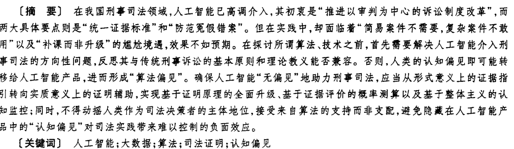 在我国刑事司法领域,人工智能已高调介入,其初衷是“推进以审判为中心的诉讼制度改革”,而 两大具体要点则是“统一证据标准”和“防范冤假错案”。但在实践中,却面临着“简易案件不需要,复杂案件不敢 用”以及“补课而非升级”的尴尬境遇,效果不如预期。在探讨所谓算法、技术之前,首先需要解决人工智能介入刑 事司法的方向性问题,反思其与传统刑事诉讼的基本原则和理论教义能否兼容。否则,人类的认知偏见即可能转 移给人工智能产品,进而形成“算法偏见”。确保人工智能“无偏见”地助力刑事司法,应当从形式意义上的证据指 引转向实质意义上的证明辅助,实现基于证明原理的全面升级、基于证据评价的概率测算以及基于整体主义的认 知监控;同时,不得动摇人类作为司法决策者的主体地位,接受来自算法的支持而非支配,避免隐藏在人工智能产 品中的“认知偏见”对司法实践带来难以控制的负面效应。