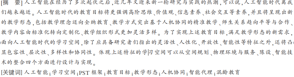 人工智能在经历了多次起伏之后,近几年又迎来新一轮研究与实践的热潮,可以说,人工智能时代离我们越来越近。人工智能时代的教育目标将更强调高阶思维、价值观、信息素养、社会交互等素养,并且将呈现出新的教学形态,包括教学理念迈向全纳教育、教学方式突出基于人机协同的精准教学、师生关系趋向平等与合作、教学内容由标准化转向定制化、教学组织形式更加灵活多样。为了实现上述教育目标,满足教学形态的新需求,面向人工智能时代的学习空间,除了应具备研究者们指出的灵活性、人性化、开放性、智能性等特征之外,还将凸显包容性、层次性、多样性和协同性。体现上述特征的学习空间可以从空间规划、物理环境与服务、陈设、智能技术的整合四个方面进行设计与实现。