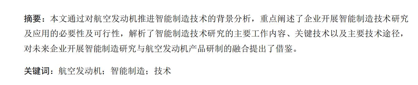 本文通过对航空发动机推进智能制造技术的背景分析,重点阐述了企业开展智能制造技术研究 及应用的必要性及可行性,解析了智能制造技术研究的主要工作内容、关键技术以及主要技术途径, 对未来企业开展智能制造研究与航空发动机产品研制的融合提出了借鉴。