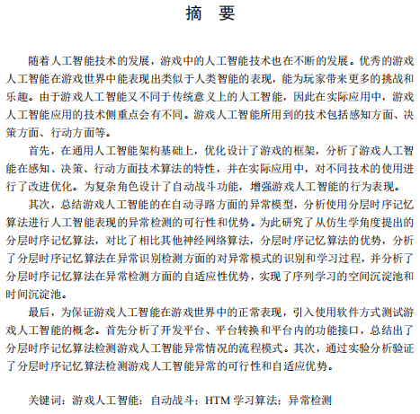 随着人工智能技术的发展,游戏中的人工智能技术也在不断的发展。优秀的游戏 人工智能在游戏世界中能表现出类似于人类智能的表现,能为玩家带来更多的挑战和 乐趣。由于游戏人工智能又不同于传统意义上的人工智能,因此在实际应用中,游戏 人工智能应用的技术侧重点会有不同。游戏人工智能所用到的技术包括感知方面、决 策方面、行动方面等
