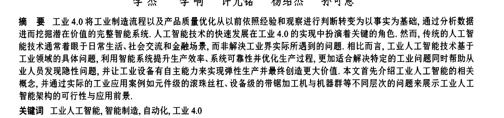 4.0将工业制造流程以及产品质量优化从以前依照经验和观察进行判断转变为以事实为基础,通过分析数据 进而挖掘潜在价值的完整智能系统.人工智能技术的快速发展在工业4.0的实现中扮演着关键的角色.然而,传统的人工智 能技术通常着眼于日常生活、社会交流和金融场景,而非解泱工业界实际所遇到的问题.相比而言,工业人工智能技术基于 工业领域的具体问题,利用智能系统提升生产效率、系统可靠性并优化生产过程,更加适合解决特定的工业问题同时帮助从 业人员发现隐性问题,并让工业设备有自主能力来实现弹性生产并最终创造更大价值.本文首先介绍工业人工智能的相关 概念.并通过实际的工业应用案例如元件级的滚珠丝杠、设备级的带锯加工机与机器群等不同层次的问题来展示工业人工 智能架构的可行性与应用前景.