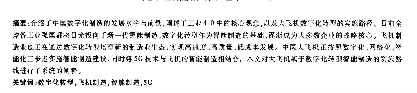 介绍了中国数字化制造的发展水平与前景,阐述了工业4.0中的核心观念,以及大飞机数字化转型的实施路径。目前全 球各工业强国都将目光投向了新一代智能制造,数字化转型作为智能制造的基础,逐渐成为大多数企业的战略核心。飞机制 造业也正在通过数字化转型培育新的制造业生态,实现高速度、高质量、低成本发展。中国大飞机正按照数字化、网络化、智 能化三步走实施智能制造建设,同时将5G技术与飞机的智能制造相结合。本文对大飞机基于数字化转型智能制造的实施路 线进行了系统的阐释。
