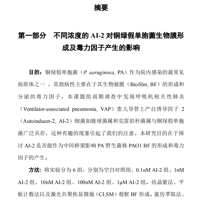 铜绿假单胞菌(P. aeruginosa, PA)作为院内感染的最常见 病原体之一 ,其致病性主要在于其生物被膜(Biofilm, BF)的形成和 分泌的毒力因子,本课题组前期调查中发现呼吸机相关性肺炎 (Ventilator-associated pneumonia, VAP)患儿导管上产自诱导因子 2 (Autoinducer-2, AI-2)细菌如链球菌属和克雷伯杆菌属与铜绿假单胞 菌广泛共存,这种有趣的现象引起了我们的注意。本研究目的在于探 讨 AI-2 是否能作为中间桥梁影响 PA 野生菌株 PAO1 BF 的形成和毒力 因子的产生。