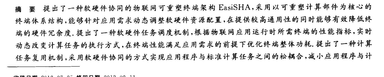 出了一种软硬件协同的物联网可重塑终端架构EasiSHA,采用以可重塑计算部件为核心的 终端体系结构,能够针对应用需求动态调整软硬件资源配置,在提供较高通用性的同时能够有效降低终 端的硬件冗余度.提出了一种软硬件任务调度机制,根据物联网应用运行时所需终端的性能指标,实时 动态改变计算任务的执行方式,在终端性能满足应用需求的前提下优化终端整体功耗.提出了一种计算 任务复用机制,采用软硬件协同的方式实现应用程序与标准计算任务之间的松耦合,减小应用程序与计 收稿日期:2012—07—25;修回日期:2012-09 11 基金项目:国家“九七三”重点基础研究发展计划基金项目(2011CB302803);中国科学院战略性先导科技专项项目(XDA06010403);国家自 然科学基金项目(61003293);北京市自然科学基金项目(4112054);江苏省自然科学基金重点研究专项项目(BK2011007);国家科 技重大专项项目(2010ZX03006—006) 通信作者:李栋(1idong@ict.ac.cn) 万方数据 960 计算机研究与发展2014,51(5) 算任务之间的关联度,并结合云端任务共享机制实现任务的可复用性,能够有效优化物联网应用的开发 速度和成本.