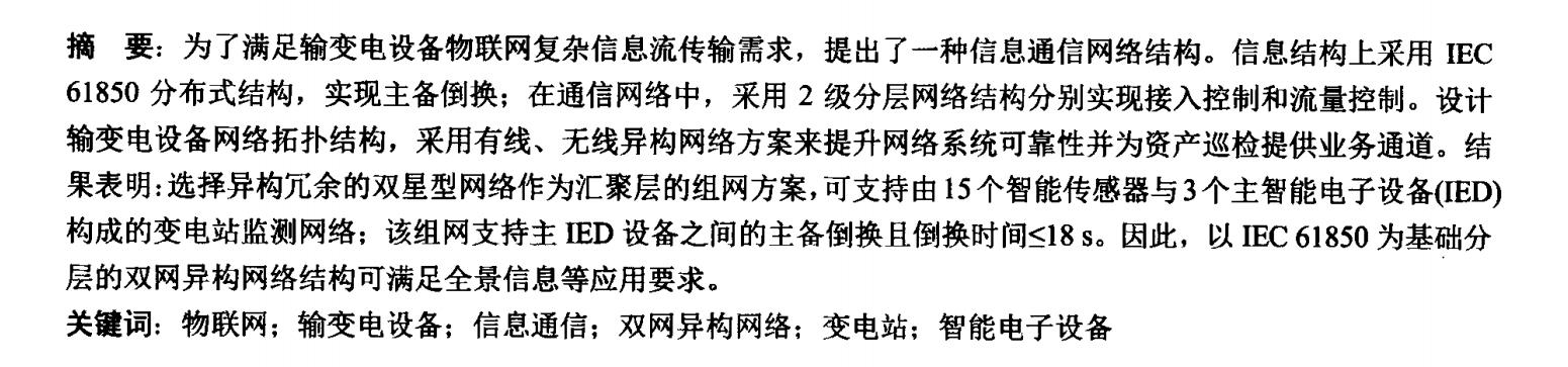 为了满足输变电设备物联网复杂信息流传输需求,提出了一种信息通信网络结构。信息结构上采用IEC 61850分布式结构,实现主备倒换;在通信网络中,采用2级分层网络结构分别实现接入控制和流量控制。设计 输变电设备网络拓扑结构,采用有线、无线异构网络方案来提升网络系统可靠性并为资产巡检提供业务通道。结 果表明:选择异构冗余的双星型网络作为汇聚层的组网方案,可支持由15个智能传感器与34"主智能电子设备(roD) 构成的变电站监测网络;该组网支持主lED设备之间的主备倒换且倒换时间<18 S。因此,以1EC 61850为基础分 层的双网异构网络结构可满足全景信息等应用要求。