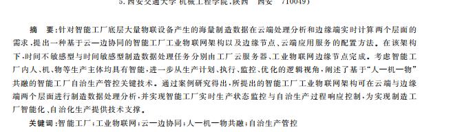 针对智能工厂底层大量物联设备产生的海量制造数据在云端处理分析和边缘端实时计算两个层面的 需求,提出一种基于云—边协同的智能工厂工业物联网架构以及边缘节点、云端应用服务的配置方法。在该架构 下,时间不敏感型与时间敏感型制造数据处理任务分别由工厂云服务器、工业物联网边缘节点完成。考虑智能工 厂内人、机、物等生产主体均具有智能,进一步从生产计划、执行、监控、优化的逻辑视角,阐述了基于"人—机—物" 共融的智能工厂自治生产管控关键技术。通过案例研究得出,所提出的智能工厂工业物联网架构可在云端与边缘 端两个层面进行制造数据处理分析,并实现智能工厂实时生产状态监控与自治生产过程响应控制,为实现制造工 厂智能化、自治化生产提供技术支撑。